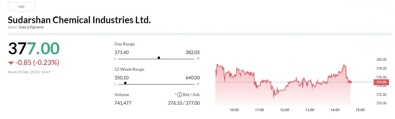Sudarshan Chemical Industries large trade | 8.46 lakh (1.22% equity) worth Rs 31.85 crore change hands at an average of Rs 376.25 per share