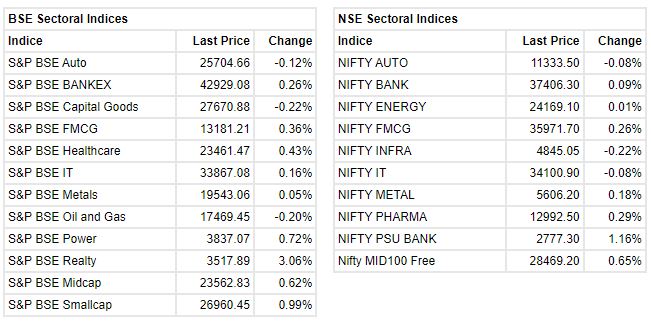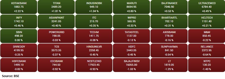 Markets traded lackluster in a narrow range and finally ended marginally lower. Initially, the benchmark opened marginally higher however lack of follow-up buying capped upside. It hovered in a narrow band for most of the session which finally ended with a breakdown. Consequently, the Nifty index closed at 17,063.25 levels; down by 0.2%. Meanwhile, noticeable action on the broader front kept the participants busy. Mostly sectoral indices, barring realty, ended flat to marginally lower in line with the benchmark.