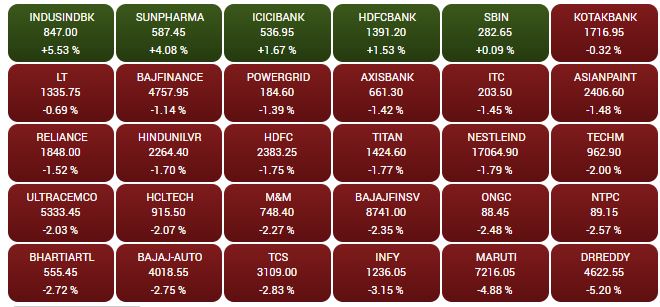 Only four stocks - IndusInd Bank, Sun Pharma, ICICI Bank and HDFC Bank - could manage to end in the green in the Sensex index.... Read More