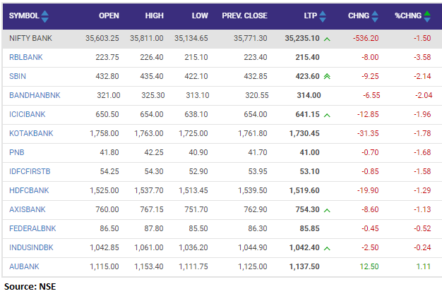 | Bharti Airtel | 2,010.60 | -84.30 | -4.02% |