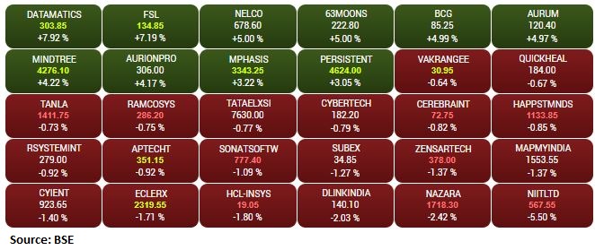 BSE Information Technology index gained 1 percent supported by the Datamatics Global Services, Firstsource Solutions, NELCO
