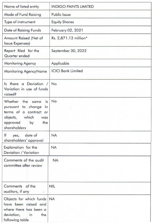Statement of Deviation or Variation in utilization of funds raised by Indigo Paints