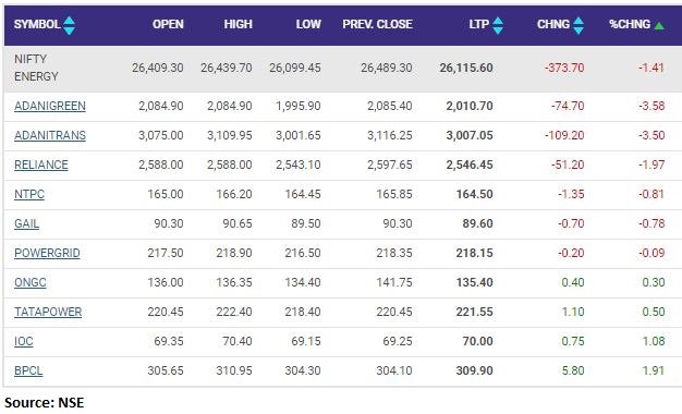 Nifty Energy index declined 1 percent dragged by the Adani Green, Adani Transmission, Reliance Industries