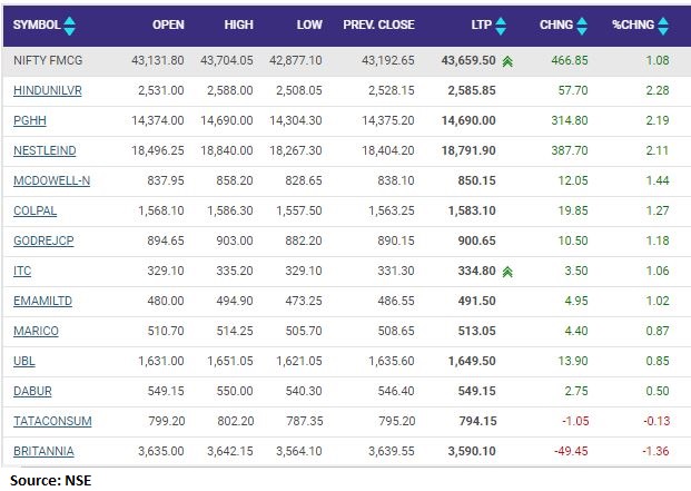 Nifty FMCG index rose over 1 percent supported by the Hindustan Unilever, Procter & Gamble Hygiene, Nestle India