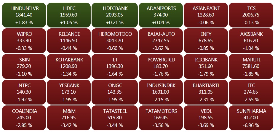 HUL, HDFC, and HCL Technologies are the top gainers, while Sun Pharma, Vedanta, and Hindalco have lost the most.