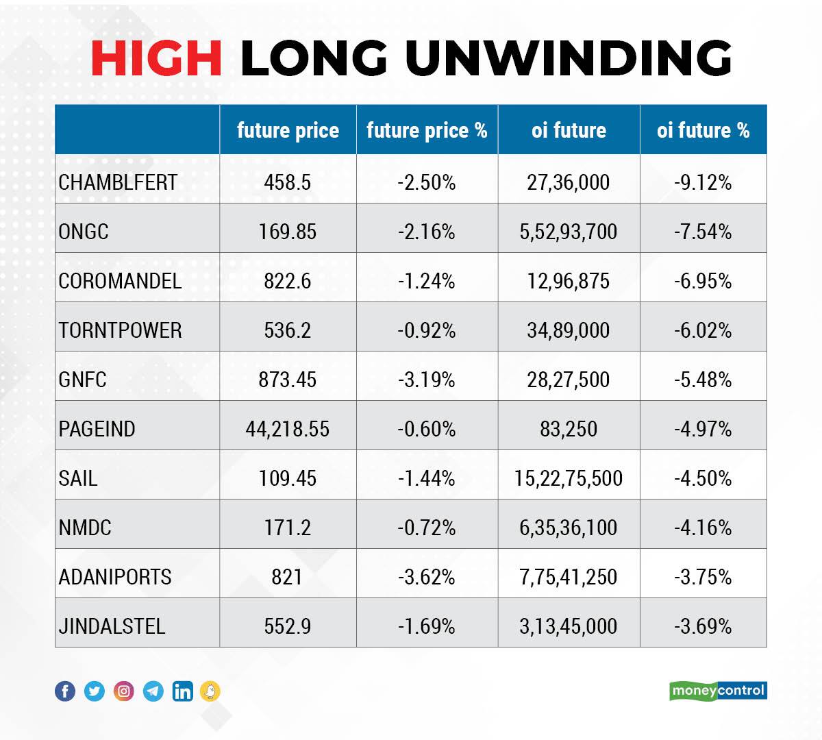 A decline in open interest, along with a decrease in price, mostly indicates a long unwinding. Based on the open interest future percentage, here are the top 10 stocks including Chambal Fertilizers, ONGC, Coromandel International, Torrent Power, and GNFC, in which long unwinding was seen.