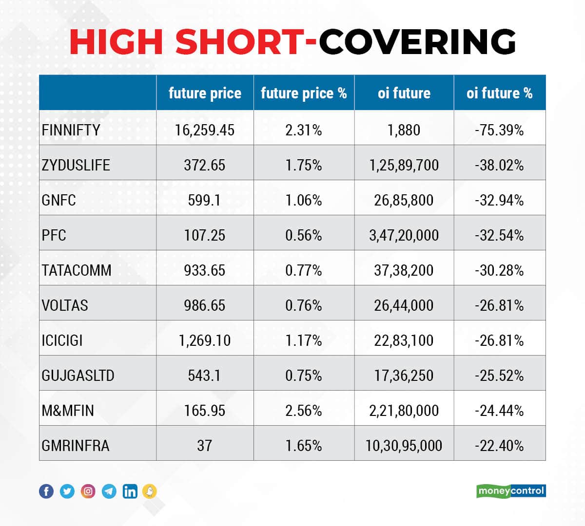 A decrease in open interest, along with an increase in price, mostly indicates a short-covering. Based on the open interest future percentage, here are the top 10 stocks including Nifty Financial, Zydus Life, GNFC, PFC, and Tata Communications, in which short-covering was seen.