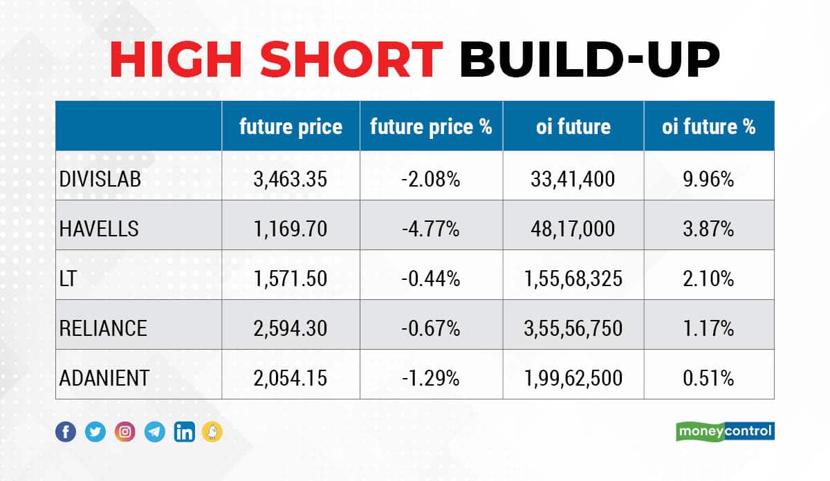 An increase in open interest, along with a decrease in price, mostly indicates a build-up of short positions. Based on the open interest future percentage, here are the five stocks - Divi's Laboratories, Havells India, Larsen & Toubro, Reliance Industries, and Adani Enterprises, in which a short build-up was seen.