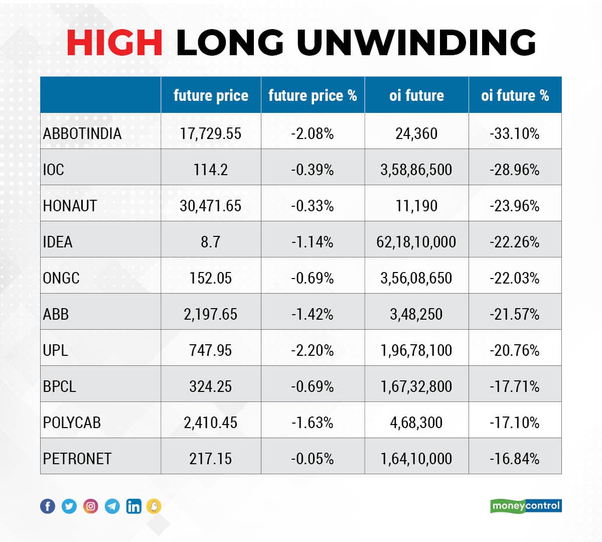 A decline in open interest, along with a decrease in price, mostly indicates a long unwinding. Based on the open interest future percentage, here are the top 10 stocks including Abbott India, IOC, Honeywell Automation, Vodafone Idea, and ONGC, in which long unwinding was seen.