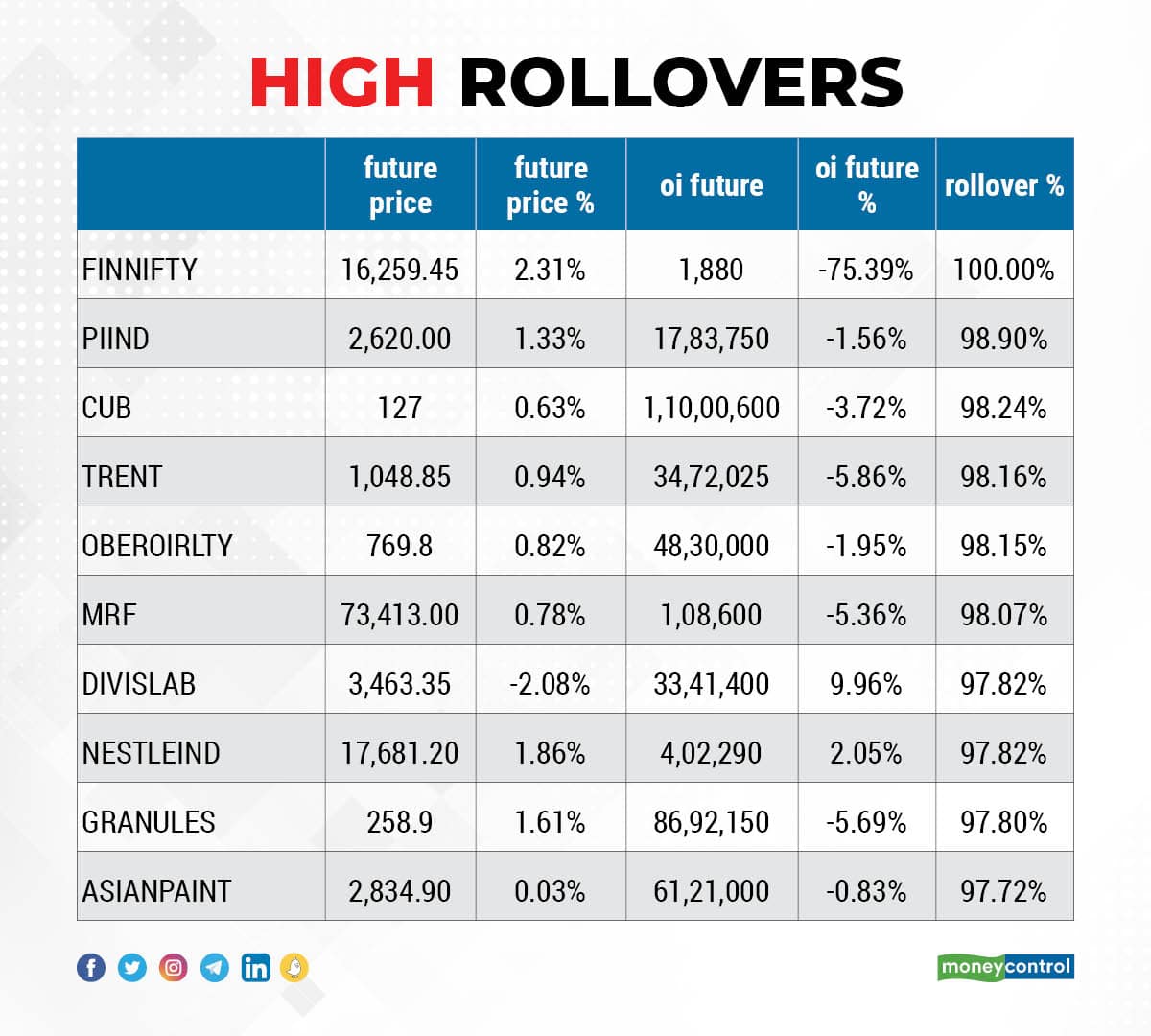 Here are the top 10 stocks which saw highest rollovers on expiry day including Nifty Financial, PI Industries, City Union Bank, Trent, and Oberoi Realty.