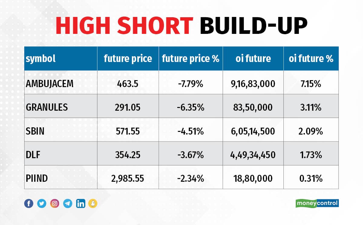 An increase in OI, along with a decrease in price, mostly indicates a build-up of short positions. Based on the OI percentage, we have seen short build-up in 5 stocks - Ambuja Cements, Granules India, State Bank of India, DLF, and PI Industries - on Wednesday.