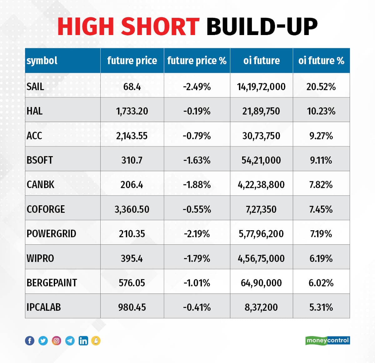 An increase in open interest, along with a decrease in price, mostly indicates a build-up of short positions. Based on the open interest future percentage, here are the top 10 stocks including SAIL, Hindustan Aeronautics, ACC, Birlasoft, and Canara Bank, in which a short build-up was seen.