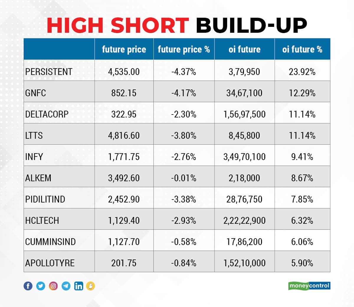 An increase in open interest, along with a decrease in price, mostly indicates a build-up of short positions. Based on the open interest future percentage, here are the top 10 stocks including Persistent Systems, GNFC, Delta Corp, L&T Technology Services, and Infosys, in which a short build-up was seen.