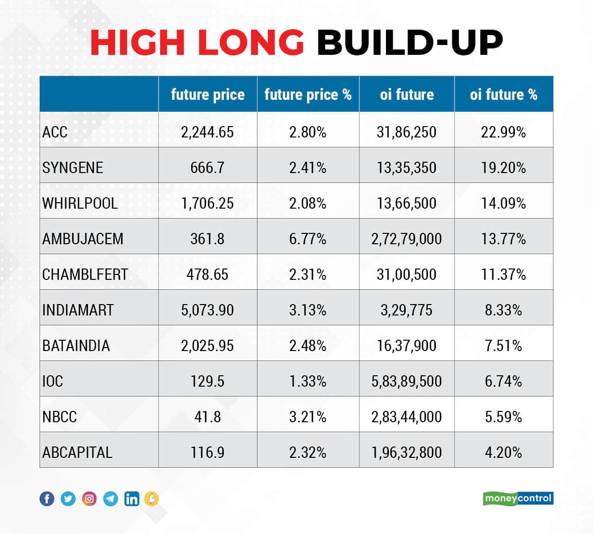 An increase in open interest, along with an increase in price, mostly indicates a build-up of long positions. Based on the open interest future percentage, here are the top 10 stocks including ACC, Syngene International, Whirlpool of India, Ambuja Cements, and Chambal Fertilizers, in which a long build-up was seen.
