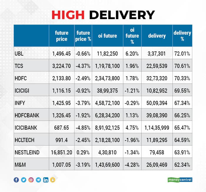 A high delivery percentage suggests that investors are showing interest in these stocks. The highest delivery was seen in United Breweries, TCS, HDFC, ICICI Lombard General Insurance, and Infosys, among others.