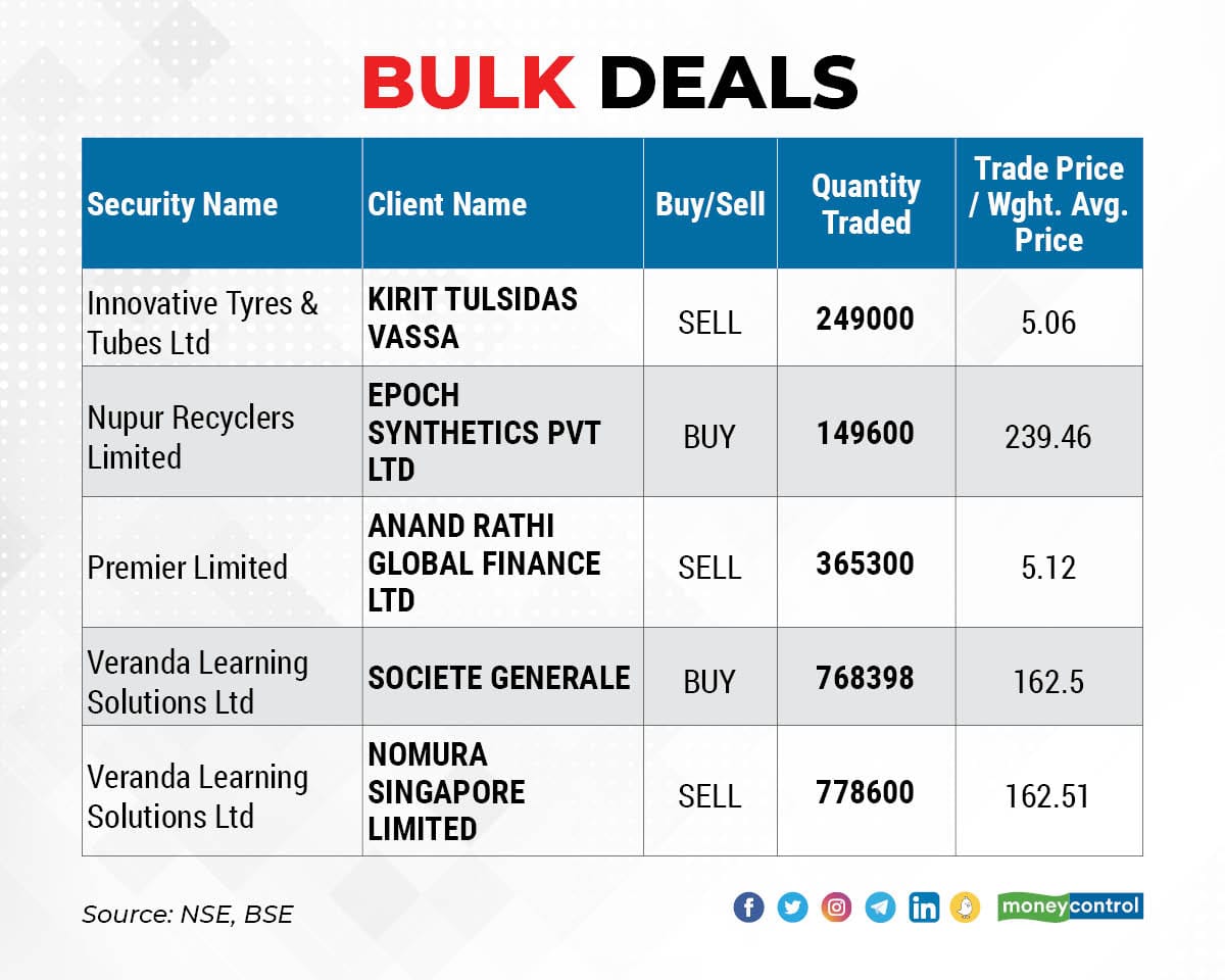 Veranda Learning Solutions: Nomura Singapore exited the company by selling additional 7,78,600 equity shares at an average price of Rs 162.51 per share, via open market transactions. However, European financial services group Societe Generale acquired 7,68,398 equity shares in Veranda at an average price of Rs 162.50 per share.
