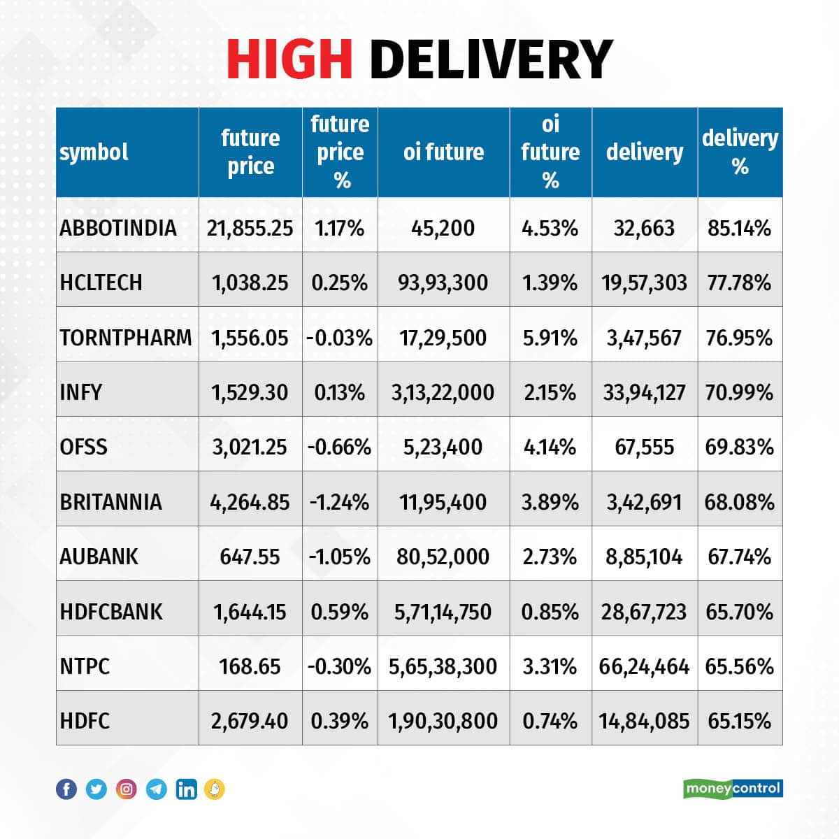 A high delivery percentage suggests that investors are showing interest in these stocks. We have seen the highest delivery in Abbott India, HCL Technologies, Torrent Pharma, Infosys, and Oracle Financial, among others.
