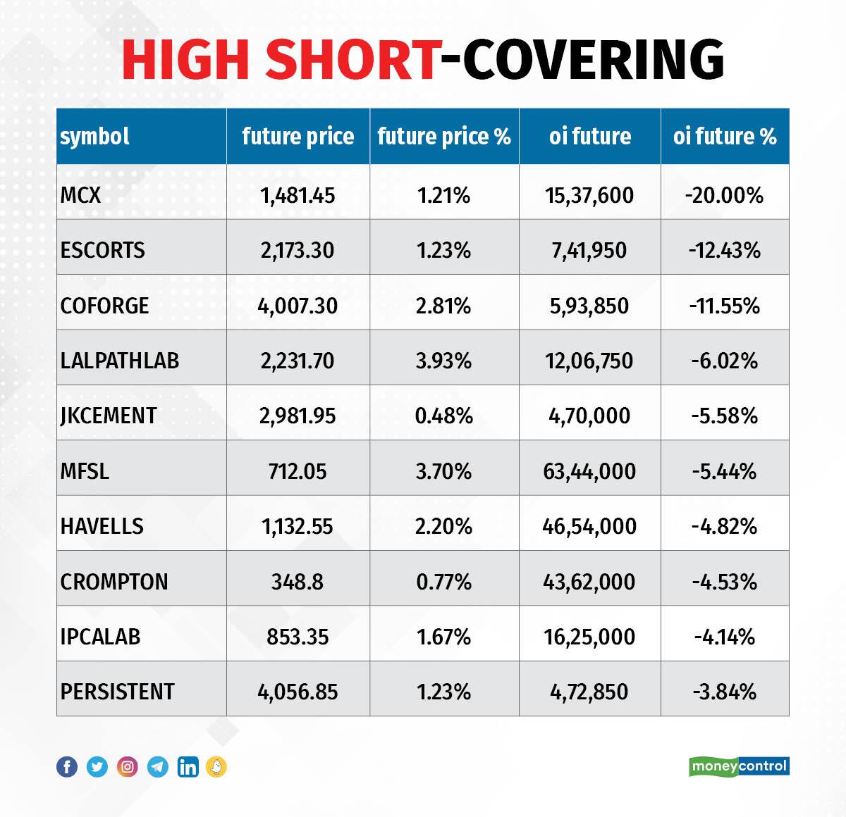 A decrease in OI, along with an increase in price, mostly indicates a short-covering. Based on the OI percentage, we have a total of 54 stocks in the short-covering list on Tuesday, including MCX India, Escorts, Coforge, Dr Lal PathLabs, and JK Cement.