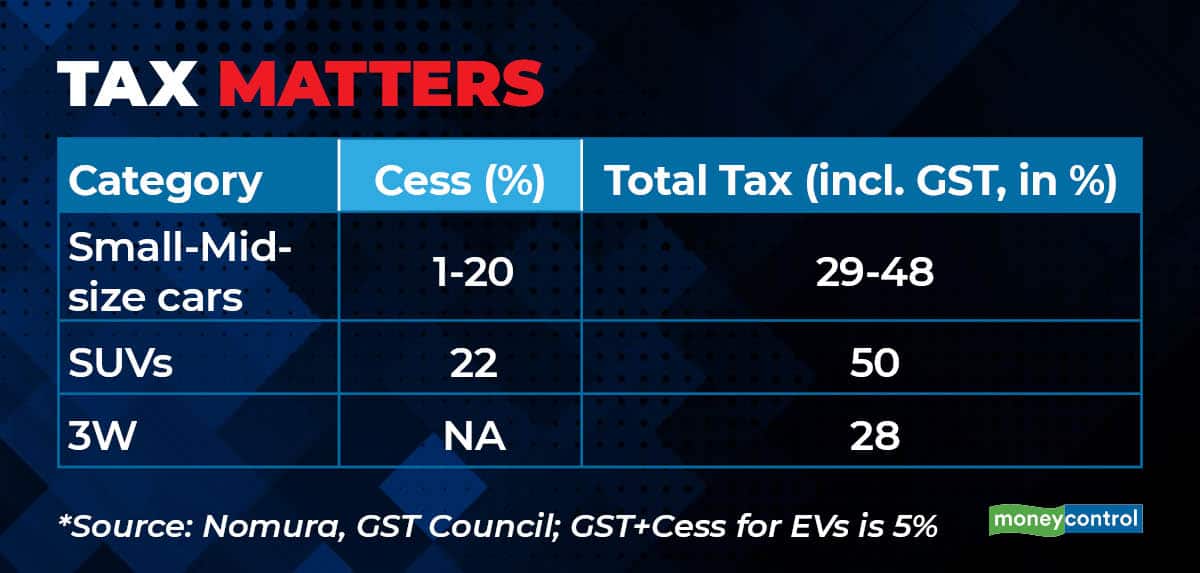 Sports Utility Vehicles (SUVs) attract the highest tax among cars, when the Goods and Services Tax (GST) compensation cess is added to the bill. The GST rate for cars, three-wheelers (3W) and two-wheelers (2W) is uniformly 28%, while that for electric vehicles (EVs) is 5%. But, when the compensation cess is added to the base GST rate, the tax differential shoots up. Then the total tax on SUVs goes up to 50%, while it goes up to 28% to 48% for other categories. Nomura, in its recent report, has said that it maintains its view that “the large SUV segment is the sweet spot to launch EVs due to the wide GST differential”