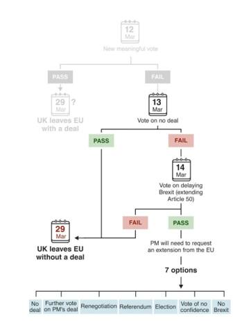 What next? In the immediate future there are two crucial steps to be followed. On March 13, UK parliament has to vote on a no-deal Brexit. If it is defeated then on the following day (March 14) Parliament has to vote on Article 50, i.e. whether to extend the March 29 deadline.