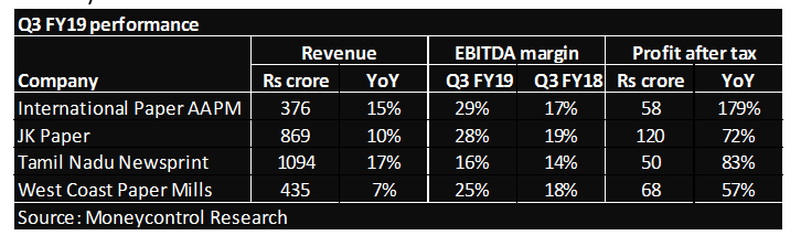 Paper companies turned around sharply in FY17 and the sustained improvement in their financials continued in the third quarter of FY19 as well. Their superior financial performance was reflected in the stock prices which have seen a strong rally in past few years. For instance, the JK Paper stock has generated a compounded annual return (CAGR) of around 50 percent in the last 3 years.