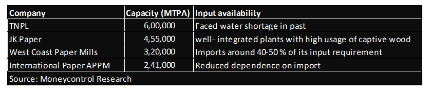 JK Paper stands out as it sources more than 80 percent of its wood requirements from captive farm forestry. Additionally, adequate water is available at both of its units in Gujarat and Odisha and it has also achieved self-sufficiency in power.