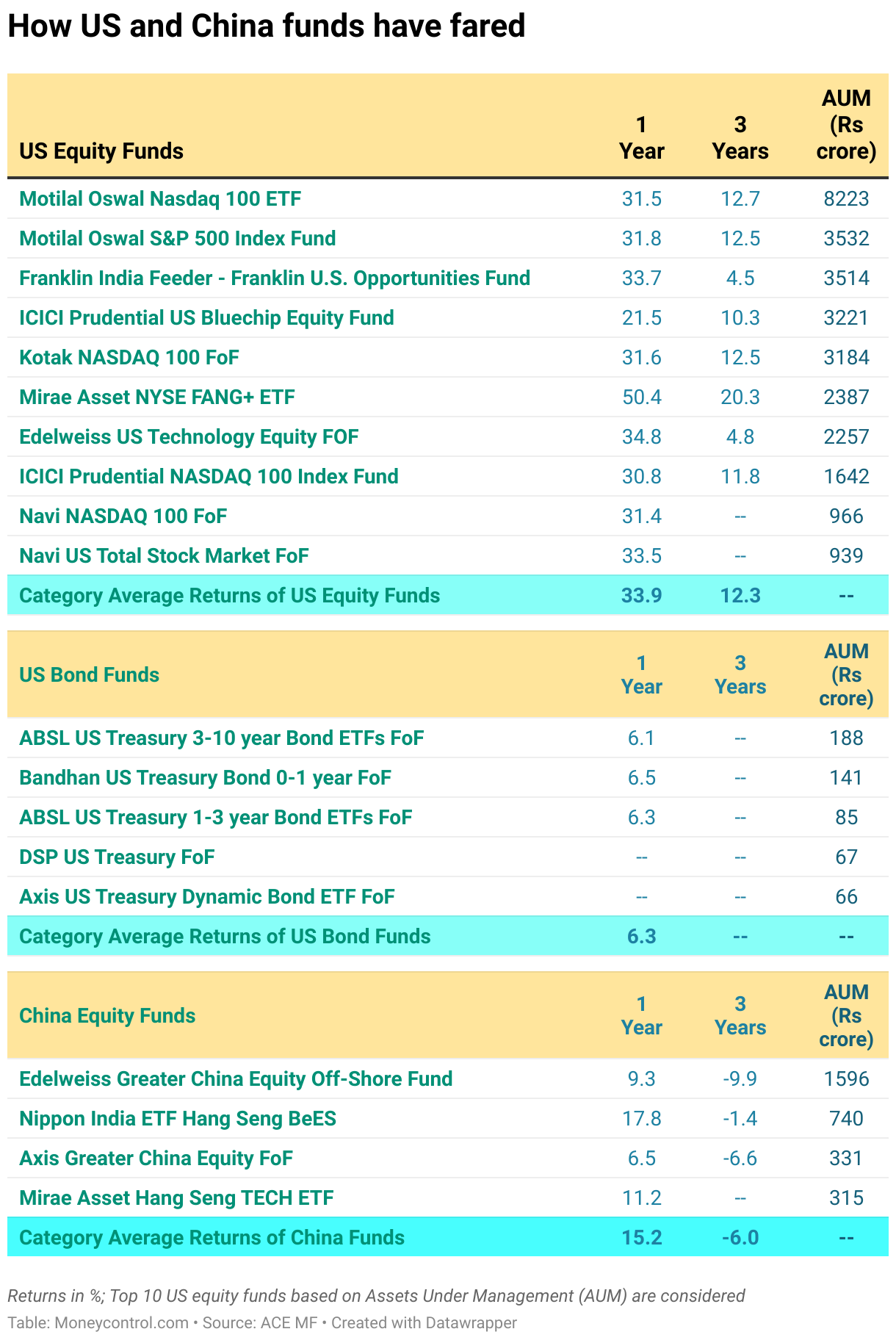 Data available with ACE MF, a mutual fund research platform, shows that US equity funds on average has delivered 33.9 percent and 12.3 percent compounded annual growth rate (CAGR) returns over one-year and three-year basis.