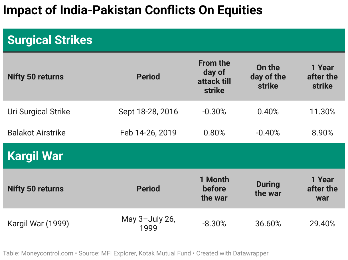 The government action suggests a low possibility of a war, a Kotak Mutual Fund note said. "However, in case of a full-blown war, we must note that since 1950, India has seen four major wars. In the last major conflict (Kargil-1999), the equity markets have remained robust after an initial panic," the fund house said.
