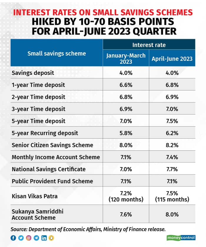 On March 31, the government hiked interest rates on small-saving schemes. Popular saving schemes like the Senior Citizens Savings Scheme (SCSS), National Savings Certificate (NSC) and Post-Office Monthly Income Scheme (POMIS) saw rates go up by as much as 70 basis points. One-hundred basis points are equivalent to a percentage point.