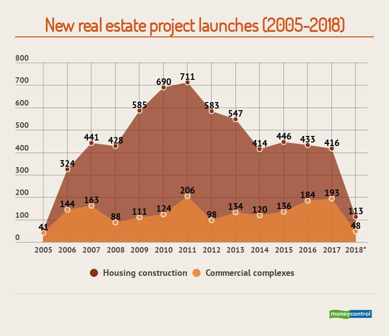Source: Centre for Monitoring Indian Economy (CMIE)Data compiled by the Centre for Monitoring Indian Economy (CMIE) shows the launch of new real estate projects in the June quarter of the current financial year has dropped by 60 percent from the year-ago period. The market for residential complexes has shrunk by 42 percent between 2011 and 2017.