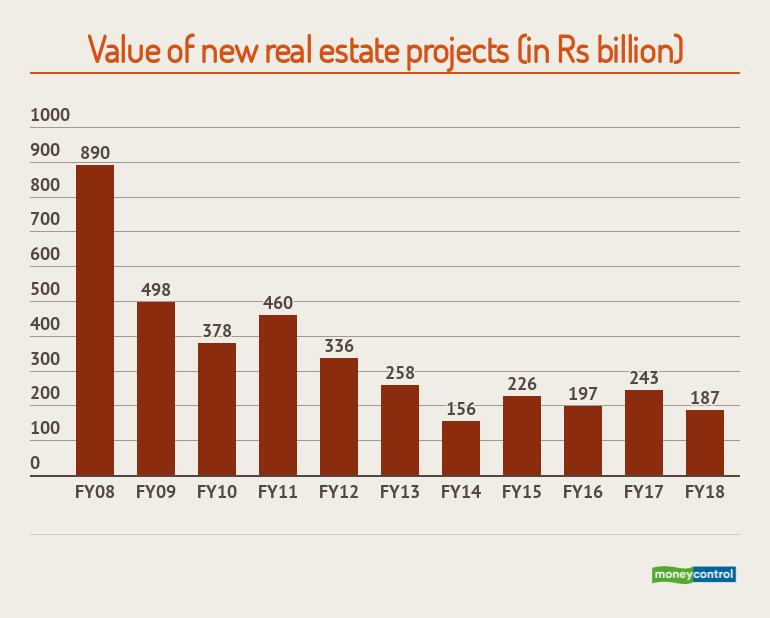 Source: Centre for Monitoring Indian Economy (CMIE)The total worth of new projects undertaken has also declined. 2018 presents an anomalous example. The number of new projects commissioned in the first half of 2018 is significantly fewer than those for the previous year. However, data suggests that these are big-ticket projects. The total worth of real estate development undertakings in the first half of 2018 is in the same ballpark as the figure for 2016.