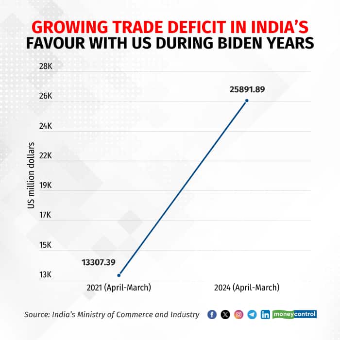 Data from commerce ministry shows that the trade deficit in India’s favour jumped from $13.3 billion during April-March 2021 to $25.9 billion in the same period in 2024. A period that marks the Biden presidency years.