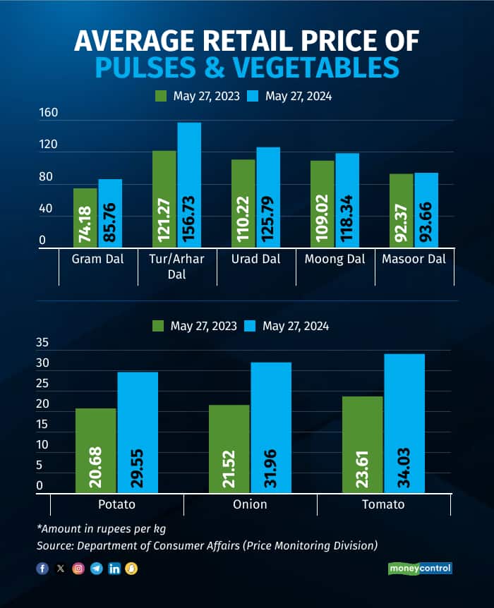 In the capital of Delhi, consumers had to shell out Rs 38 more for a kilogram of Tur\Arhar on May 27 compared to the same day last year, while for the same amount of potatoes residents of Maharashtra paid Rs 36, higher than Rs 24 in the same comparative period.