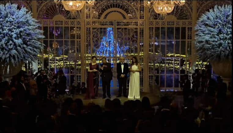 The event began with Mukesh Ambani greeting all of the guests for the evening with his welcome speech. His wife Nita Ambani and Radhika Merchant's parents Viren and Shaila Merchant joined him on the stage.