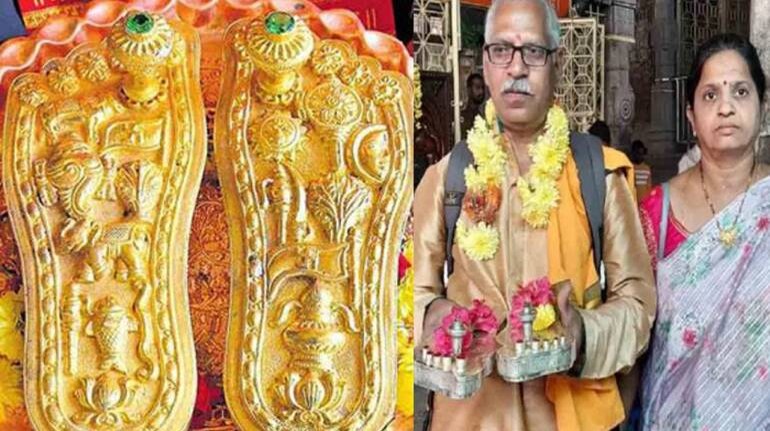 After he commenced the padayatra in July 2023, somewhere along the way he felt the footwear should be embellished further and covered with gold. So he gave them to a firm in Hyderabad. Pittampalli Ramalinga Chari of Kala Kutir received this assignment. Chari covered the footwear first with panchalohas or the five auspicious metals (often used for making idols in India), as gold was not going to adhere easily, straightaway, to the silver. Then gold covering was used over these panchalohas and auspicious symbols created over them. With this, the weight of the padukas is now nine kg in all.