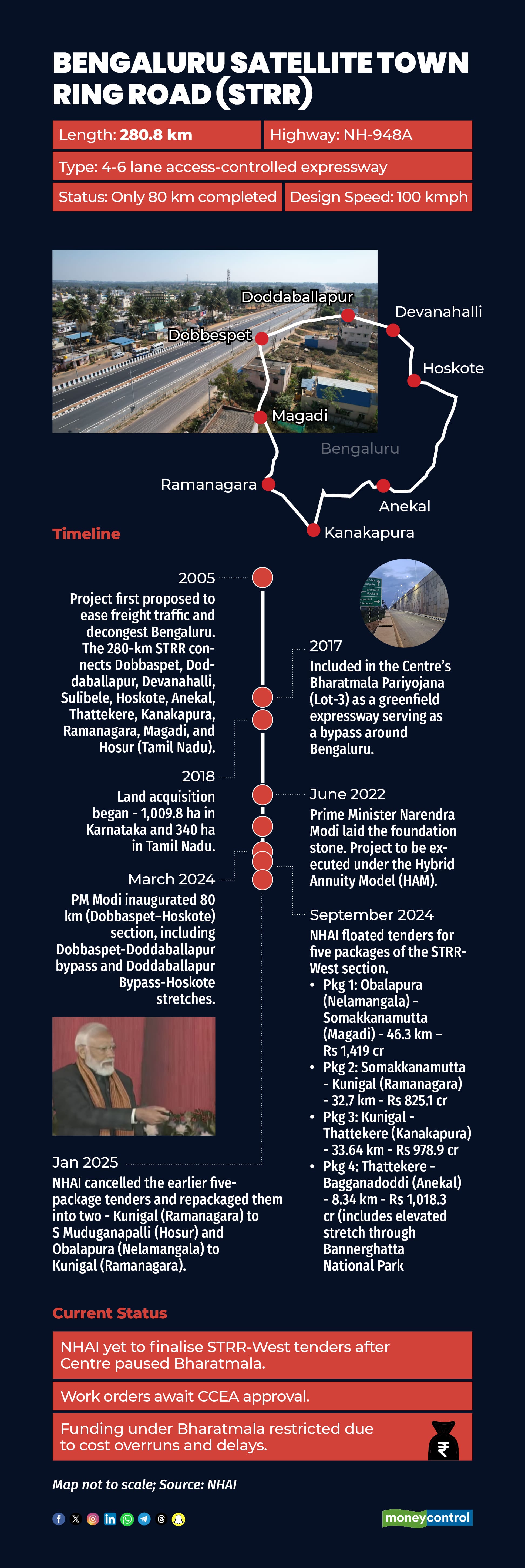 The ambitious Satellite Town Ring Road (STRR) project, aimed at easing Bengaluru's congestion, has hit a major setback after the Union government paused projects under the Bharatmala Pariyojana, citing delays and cost overruns.