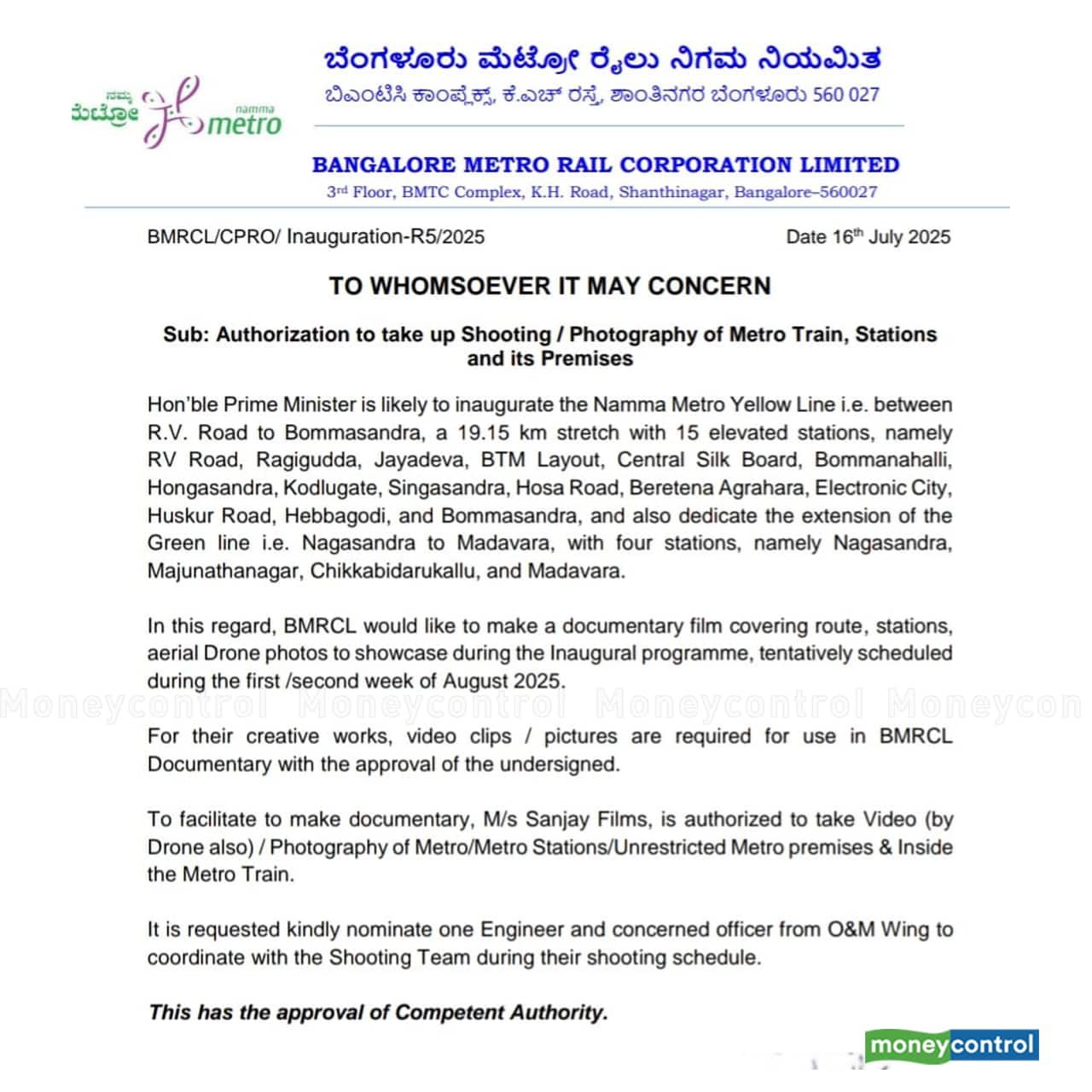 Sources said preparations are on to invite Prime Minister Narendra Modi for the inauguration in August. A document reviewed by Moneycontrol reveals BMRCL has roped-in a private firm “to make a documentary film covering the route, stations, and aerial drone visuals to be showcased during the inaugural programme, tentatively scheduled during the first or second week of August 2025.”
