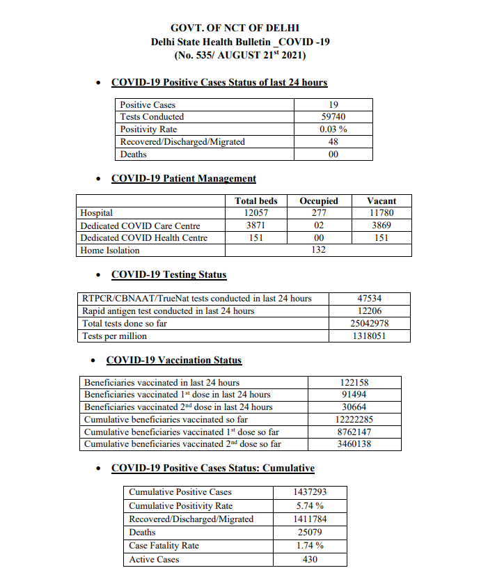 Markets in the national capital can stay open beyond 8 pm from August 23, with the Delhi government on Saturday announcing lifting of restrictions in view of a decline in COVID-19 cases in the city.No death due to COVID-19 was recorded in Delhi on Saturday, the second consecutive day the daily fatality count stood nil, while 19 fresh cases were reported, the lowest since April 15 last year, according to data shared by the city health department.