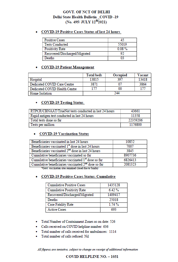 The national capital on Monday recorded 45 COVID-19 cases, the lowest single-day rise in over a year, and three deaths while the positivity rate stood at 0.08 per cent, according to data shared by the health department here.