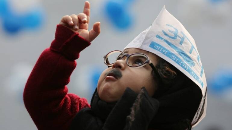 'Baby Mufflerman' was spotted early in the morning of the counting day outside Arvind Kejriwal’s residence. He was seen wearing a maroon pullover with a black muffler. The baby – one-year-old Avyaan Tomar – also sported the signature Gandhi topi with AAP’s broom symbol, a pair of spectacles and a moustache, in an attempt to look like Kejriwal.