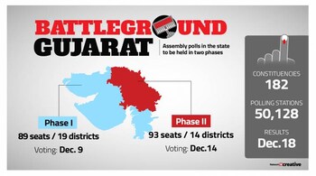 The Gujarat Assembly has 182 seats. The first phase will go to poll on December 9 in 89 assembly constituencies. The second phase polling will take place on December 14 in 93 assembly constituencies.