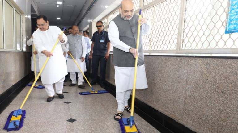 BJP president and Home Minister Amit Shah and his party colleagues mopped the floor at the AIIMS and met sanitation workers and children admitted at the hospital as he launched a "seva saptah" (week of service) on September 14 to celebrate Prime Minister Narendra Modi's birthday on September 17.