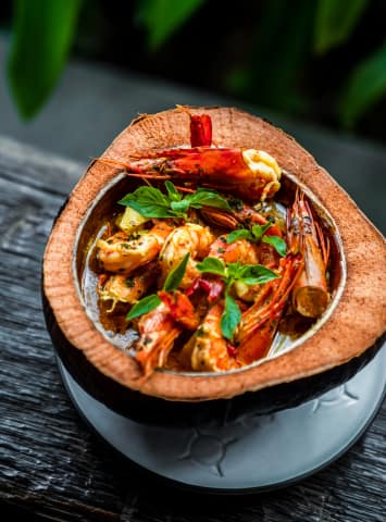 Expect less known dishes such as Juhu, which uses a traditional grilling technique and features young papaya, papaya leaves, cassava leaves, banana blossom, sweet corn, shallots, garlic, and chilies, and is wrapped and grilled in banana leaves; kepiting asap, crab marinated with ginger grass and sweet soy sauce, among others, and wrapped and cooked in banana leaves over a wood fire; and jukut kellogg mesanten, moringa leaves, and base genep (an aromatic seasoning paste integral to Balinese cuisine).