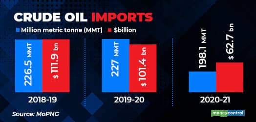 Pushed by lower consumption due to the pandemic and a dip in international crude oil prices during the first half of the financial year, 2020-21 saw a drop in India's crude oil import bill by 38 percent, based on estimates by the ministry of petroleum and natural gas. India's import bill fell from $101.4 billion in 2019-20 to $62.7 billion in 2020-21. In April, Brent crude prices had dropped to a historic low of $9.12 a barrel and the Indian Basket prices dipped to $19.9 a barrel. During the year, the consumption of crude oil in India saw a decline of 13 per cent from 227 million tonne (MT) in 2019-20 to 198 MT in 2020-21.