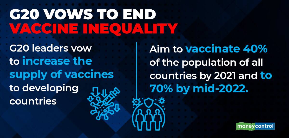 At the Rome Declaration of the G20 Summit, world leaders including Prime Minister Narendra Modi vowed to increase the supply of vaccines to developing countries emphasising vaccine' role as the most important tool against the Covid-19 pandemic. The G20 leaders also set a global goal to vaccinate at least 40 percent of the world population by 2021 and 70 percent by mid-2022. They also thanked medical and frontline workers, international organisations and scientists for their constant effort to fight the deadly pandemic. They also committed to strengthen actions to halt and reverse biodiversity loss by 2030, and achieve food security and adequate nutrition for all.