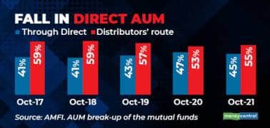 Investments in mutual funds through the direct route has fallen over past year. AMFI data shows its share in the total AUM as of October 2021 was 45%, down by two percentage points from 47% in October 2020. While retail, foreign investors and banks have shown a preference for the direct route, institutions have collectively reduced their investments through this channel. Institutions have followed this approach mainly in gilt funds, fixed-maturity plans (FMPs) and duration-based funds, and have sought advice to tide over the falling interest rates. Besides, the FMPs they had bought directly two years ago matured this year, which further reduced direct-plans' share in institutional investments.