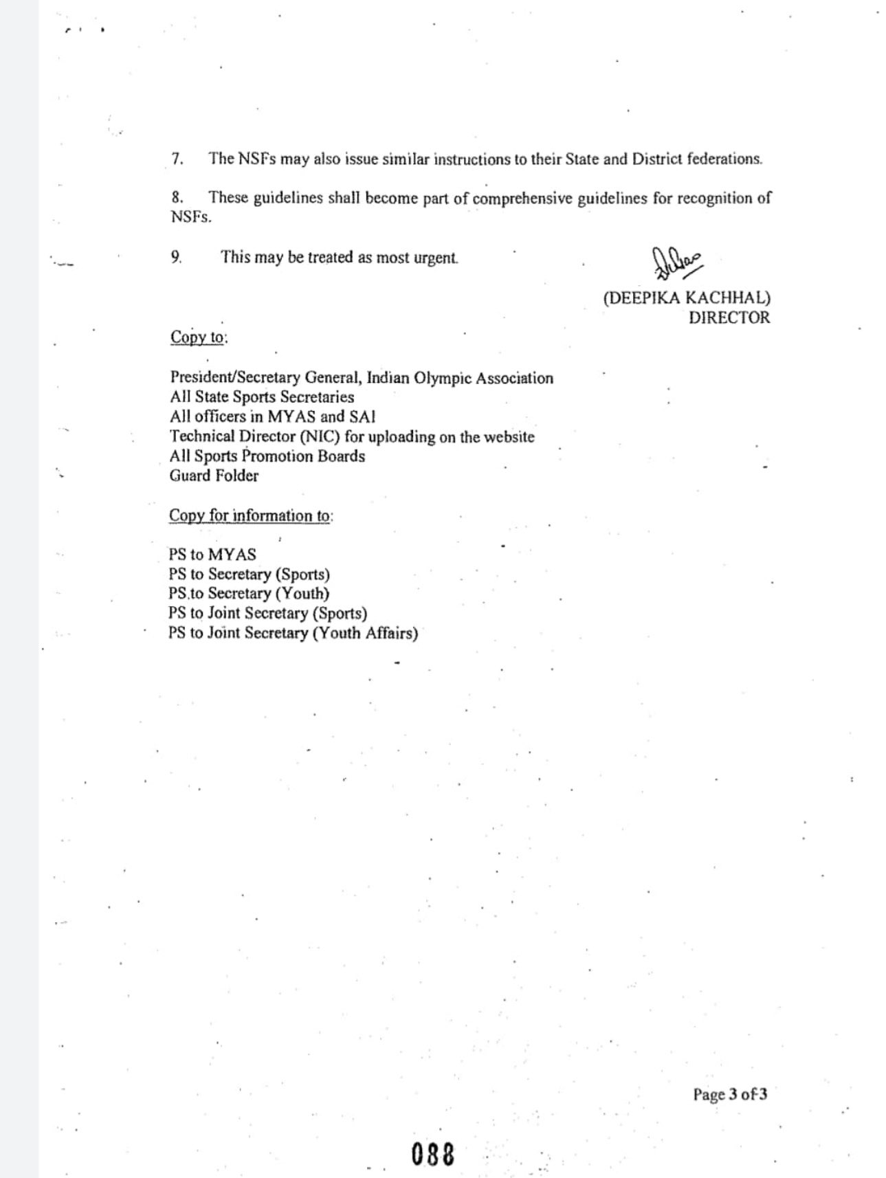 Now, at the time of granting or extending the recognition of an NSF, the Ministry of Youth Affairs and Sports stipulates that the federation shall ensure strict compliance with government guidelines to prevent unethical practices in sports such as age fraud, sexual harassment of women in sports, doping, etc.