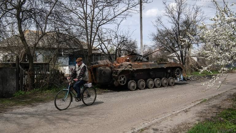 A man rides a bicycle past the debris of Russian military machinery destroyed during Russia's invasion of Ukraine, in the village of Rusaniv, Kyiv region, Ukraine. (Image: Reuters)