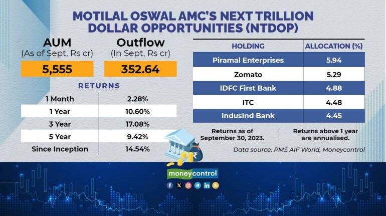 As the name suggests, the fund seeks to invest in sectors and stocks that will benefit from the next trillion-dollar GDP growth. Managed by Vaibhav Agrawal, the multicap fund is one of the biggest PMS funds, and usually sees fund flow month-on-month. It has 29 stocks, with largecap allocation at 36 percent and midcap at 43 percent. The fund’s performance, in both short and long terms, has failed to beat the benchmark. Perhaps this is the reason for the big outflow.