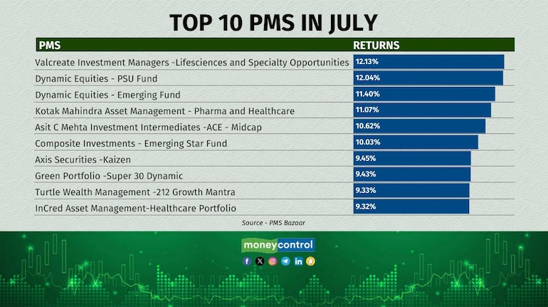 According to data from PMS Bazaar, Valcreate Investment Managers - Lifesciences and Specialty Opportunity Fund ranked first, with a return of 12.13 percent in July. It was followed by Dynamic Equities - PSU Fund and Dynamic Equities - Emerging Fund, which secured the second and third positions with returns of 12.04 percent and 11.4 percent, respectively.